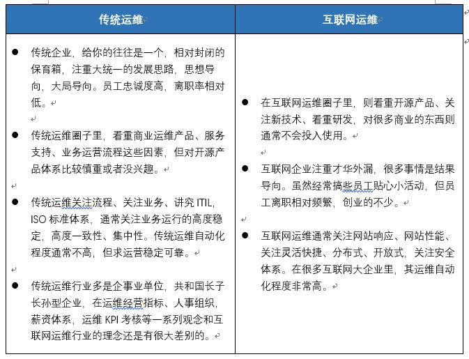 通常我们会将围绕商业封闭式系统架构(IOE 架构)的运维视作传统运维,将围绕开源系统架构的运维视作互联网运维。