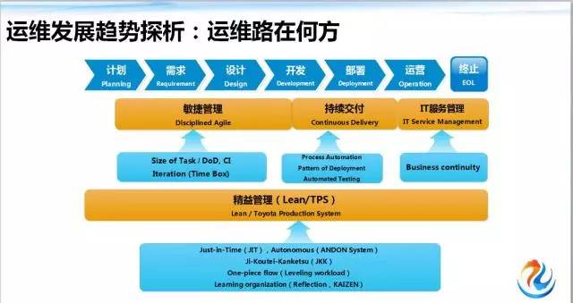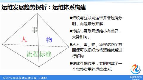在上述发展形势下,运维的人、事、物、流程规范都将相应发生变化,如人员数量会有变化,职位职责会有变化,设备资产会有变化,各种流程规范都将发生变化。