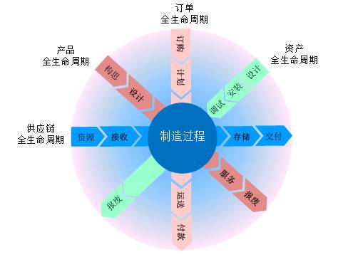 另一方面,智能制造是一个覆盖更宽泛领域和技术的“超级”系统工程,在生产过程中以产品全生命周期管理为主线,还伴随着供应链、订单、资产等全生命周期管理,如图1所示。