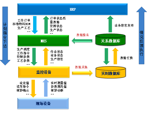 2)执行层:实现面向工厂/车间的生产管理,如维护记录、详细排产、可靠性保障等。制造执行系统(MES)在该层运行。