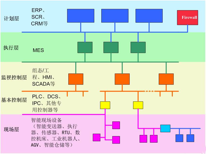 智能工厂/数字化车间互联网络各层次定义的功能以及各种系统、设备在不同层次上的分配如下。