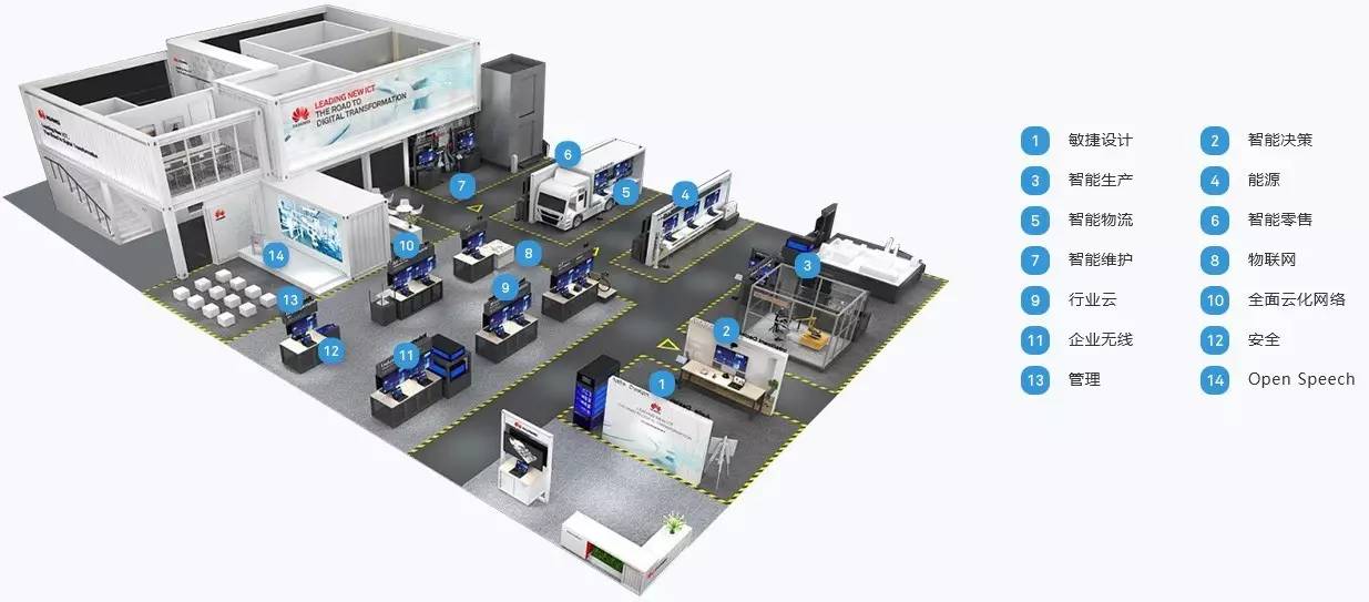 在为期五天的博览会中,华为围绕工业数字化,携手业界合作伙伴集中展示了基于物联网、行业云、全云网络、企业无线等新 ICT 技术的产品及解决方案,演绎工业数字化的全场景实践,涵盖制造、能源、交通(物流)等行业,并与 GE、英特尔、东芝、T-System 等宣布全新的重磅合作。