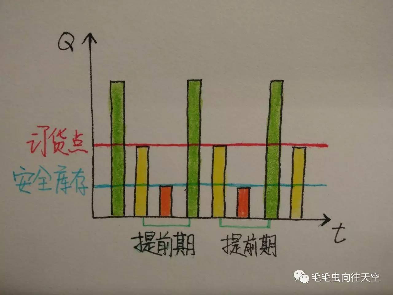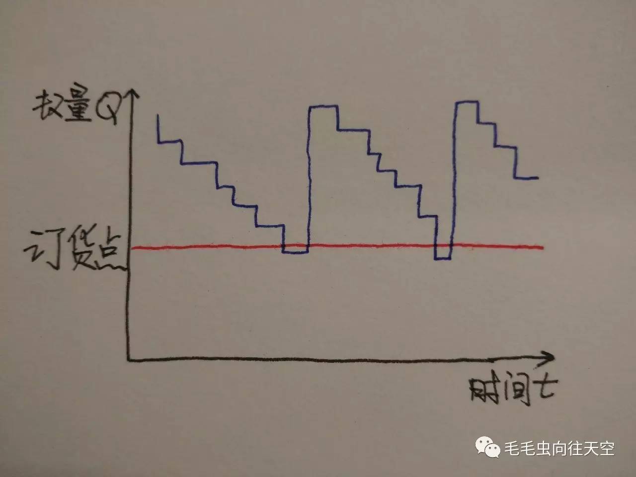 别着急,咱们慢慢来哈,MRP物料需求计划,顾名思义,主要是围绕库存展开的需求计划,库存管理最原始的管理办法是订货点法,如下图: