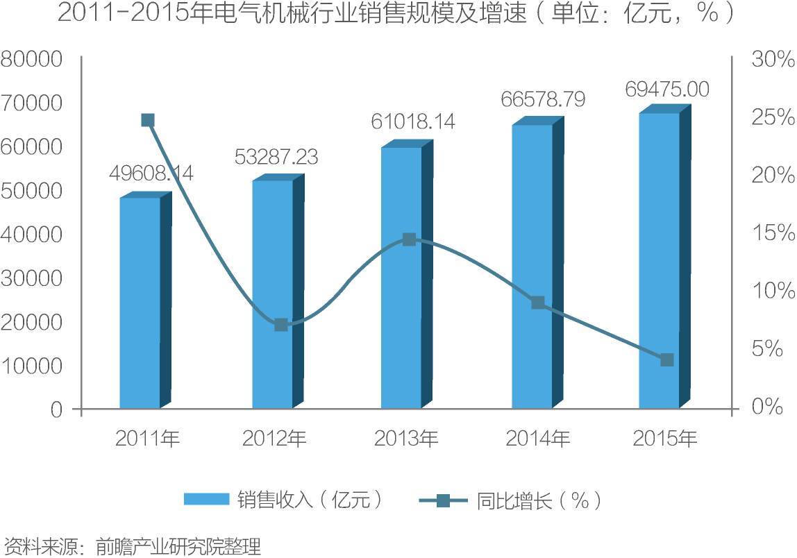 根据国家统计局的统计,2011- 2015年,我国电气机械行业销售收入逐年增长,2015年为69475亿元,同比增长4.35%。