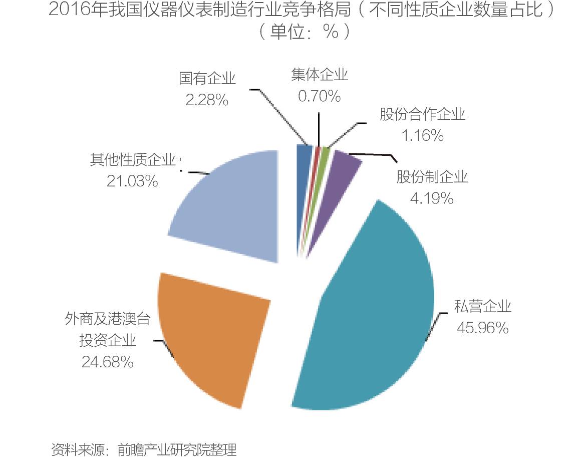目前,仪器仪表行业的国内外市场争夺进入白热化阶段,竞争较为激烈。截至2016年,我国规模以上仪器仪表制造企业有4116家,私营企业数量占比达到45.96%;外商及港澳台投资数量占比24.68%;股份制企业数量占比为4.19%;国有企业数量占比2.28%;股份合作企业和集体企业数量占比分别为1.16%和0.70%。