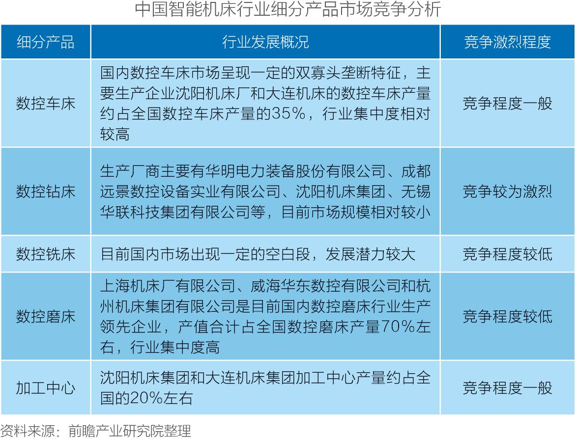 总体来看,目前我国数控机床行业主要以低端产品为主,产品技术门槛相对较低,竞争较为激烈;在中高端产品市场,目前国内仅有少数企业具备中高端产品的生产,行业竞争相对缓和。