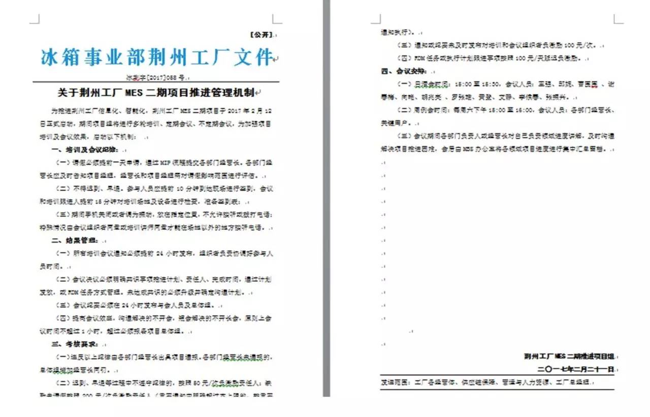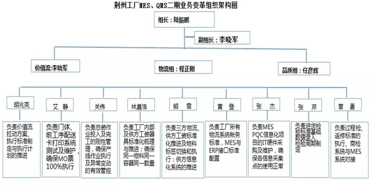 荆州工厂MES二期项目定于2017年4月份正式启动,为提升业务执行与MES系统管理无缝对接,确保MES上线后系统正常运行,荆州工厂成立了以工厂总经理陆振鹏为组长,生产部部长李晓军为副组长的MES项目业务变革专项组,从2017年2月9号开始,项目组关键用户全部集中办公。
