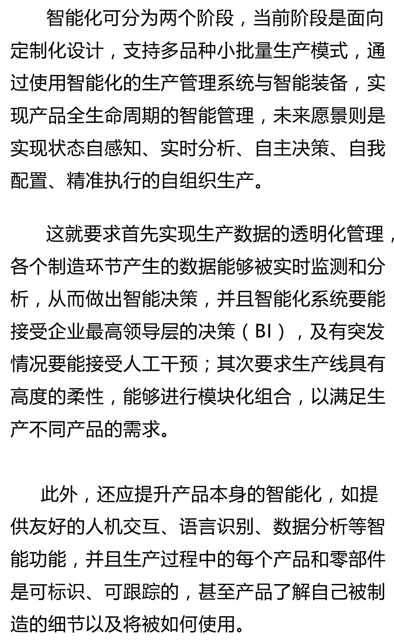 看得见的是个性化定制和智能服务,看不见的是生产制造各环节的数字化、网络化与智能化。实现智能制造,网络化是基础,数字化是工具,智能化则是目标。