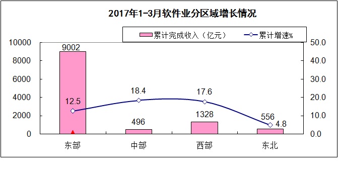 东部地区增长稳中有落,中西部地区增速快于全国。1-3月份,东部地区完成软件业务收入9002亿元,同比增长12.5%,增速同比回落3.4个百分点;西部地区完成软件业务收入1130亿元,增长17.6%,增速同比提高0.7个百分点;中部地区完成软件业务收入496亿元,增长18.4%,增速同比回落2.7个百分点;东北地区完成软件业务收入556亿元,增长4.8%,增速同比回落0.2个百分点。