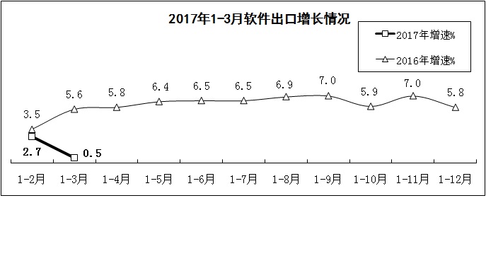 出口持续低迷。1-3月份,软件业实现出口114亿美元,同比增长0.5%,增速同比回落5.1个百分点,比前两个月下滑2.2个百分点。其中,外包服务出口下降0.9%,嵌入式系统软件出口下降1.1%。