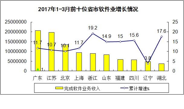 今年一季度,我国软件和信息技术服务业运行平稳,在前两个月收入和利润回落压力较大的情况下,3月份开始出现趋稳回升态势。中西部地区部分省市持续较快增长,中心城市软件业增速有所回升。