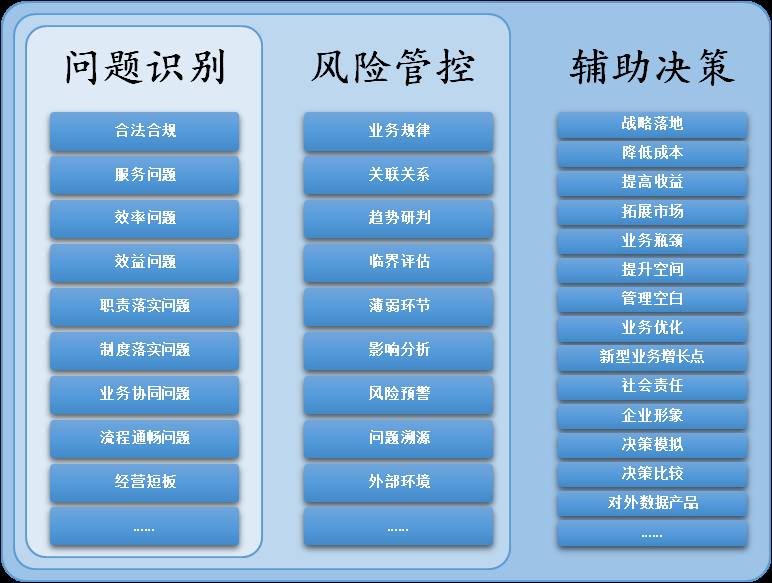 在感知与预防之上,是对企业运营的辅助决策(主动参谋),即对可能提升公司经营效果的业务空间或管理措施进行分析和评估,为经营管理者提供决策参谋。与具体问题的感知和预防相比,这一角度会在更大层面上影响企业的决策和业务变革方向。
