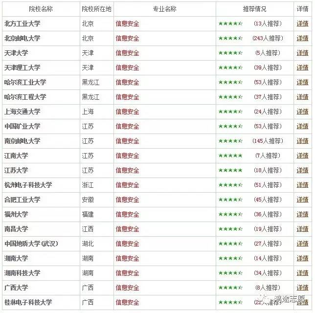 推荐专业源自高校学生实名推荐数据。当前累计投票数量超过363万人次。通过实名注册的高年级学生或毕业生,根据本校各专业办学情况进行投票,推荐优势专业或特色专业。下图仅展示了部分高校信息安全专业推荐情况,星号为推荐指数。点击图片可查看更多专业推荐数据。