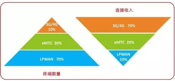 根据各类物联网终端对于网络传输速率要求的不同,一般认为通过NB-IoT等超低功耗网络接入的低速率终端数量近70%,通过eMTC等接入的中速率终端数量约超过20%,通过3G/4G接入的高速率终端数量不足10%,形成由低速到高速的金字塔形状。