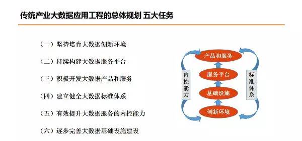 传统产业拥抱大数据时代之前,应该建立行业主导型企业的试点和应用场景预研,相关的方案我们在之前的系列文章中已经展开了策略层面的若干讨论。从大数据在产业级或大型企业总体应用规划角度,应整体布局五大重点任务与三大集中化工程。