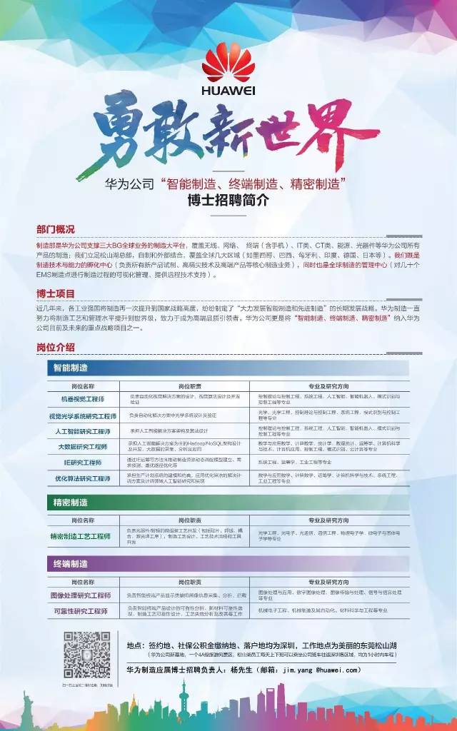 华为制造应届博士招聘负责人:杨先生(邮箱:jim.yang @huawei.com)