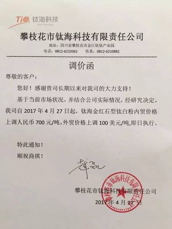 攀枝花钛海:基于当前市场情况,并结合公司实际情况,经研究决定,我司自2017年4月27日起,钛海金红石型钛白粉内贸价格上调人民币700元/吨,外贸价格上调100美元/吨,即日起执行。