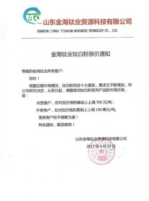 涂多多网讯:攀枝花市钛海科技有限责任公司、山东金海钛业资源科技有限公司发布钛白粉涨价通知!
