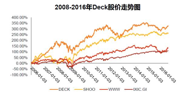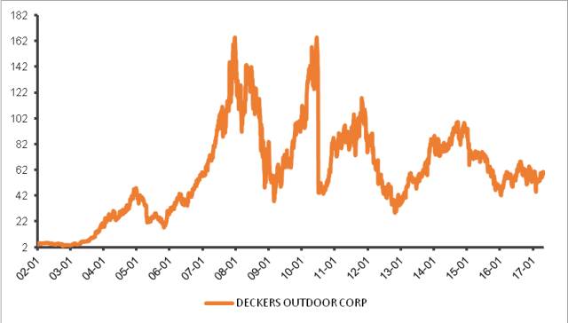再来看Deckers公司自2002年以来的股价走势,从2006年开始,Deckers股价从29美金一路飙升至最高的165美金。