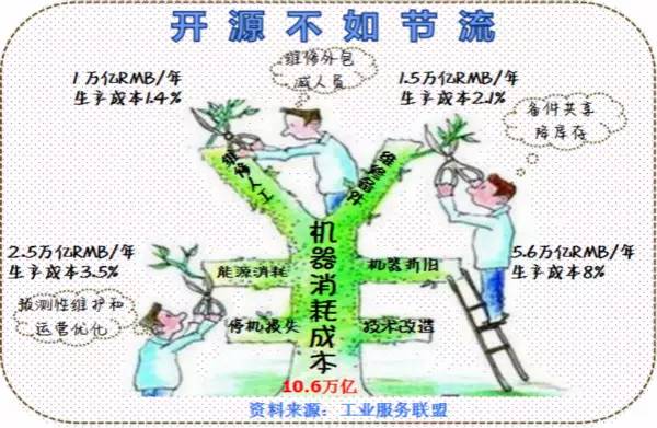 工业互联网为什么为降低机器消耗成本而生经济增长减速时代,开源不如节流,工厂成本主要发生在“人、机器、原材料”上。料的成本靠管理,比如供应链管理和丰田零库存管理;人的成本靠技术,比如机器人替代和人工智能替代;机的成本靠互联网连接,比如预测性维护和共享经济。用在“机器”这块的成本占生产经营成本的15%,放到全国来说就是10万亿,这一块成本以前没有受重视。