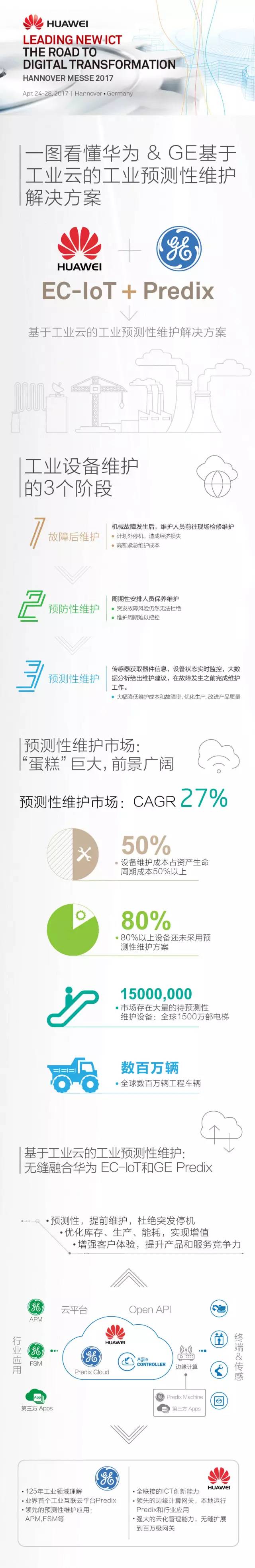 4月24日,在汉诺威工业博览会上,华为携手领先的工业互联网软件公司GE数字集团联合发布基于工业云的工业预测性维护解决方案。新方案将华为边缘计算物联网EC-IoT(Edge Computing IoT)方案和GE的工业互联网云平台Predix进行无缝融合,快速实现工业设备到云端应用的端到端互联,设备状态的实时监测,数据的分析与洞察以及维护的智能决策。