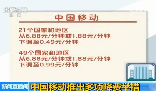 中国移动26日宣布新一轮提速降费举措,自5月1日起,大幅下调70个国家和地区的国际长途直拨资费,其中21个国家和地区从6.88元/分钟或1.88元/分钟下调至0.49元/分钟,49个国家和地区从6.88元/分钟或1.88元/分钟下调至0.99元/分钟。其余措施还包括大幅下调互联网专线资费等。