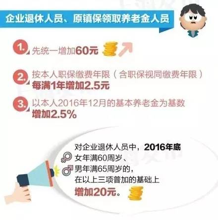 4月26日,上海市人社局宣布上调该市退休人员2017年养老金,并于5月5日前发放到位。上海上调养老金分三步,首先统一增加60元;然后按本人职保缴费年限(含视同缴费年限)每满1年增加2.5元;最后以本人2016年12月的基本养老金为基数增加2.5%。