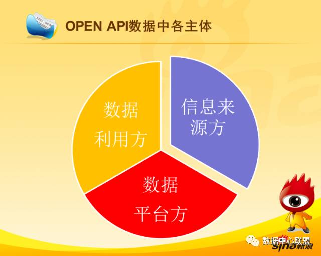回到今天所要讲的OPEN API这个例子。OPEN API是针对于我们,尤其是移动互联时代提出的新的接口。API实际上是为了有些移动应用在使用过程中获取数据,让信息沟通方便,由数据开放平台提供API的接口,一些开发者能够有效的出去。这里面有各方的主体,像信息来源,大多数情况下都是用户,当然也不排除大数据的交易平台。同时,数据的平台方,以微博为例的社交媒体平台,这里可能有一些UGC的内容,个人信息的地理标识,以及喜好,甚至相关的职业信息和教育信息,这些都是属于平台方自己的数据。同时,数据利用方,以及各方的移动APP应用,通过OPEN API的一些协议,获得相关的数据接口,实际上也是达到了数据导流的方式。此时,有效地解决数据应用的冷启动问题,有些数据平台上的用户,通过OPEN API的协议获得了新应用的适用。