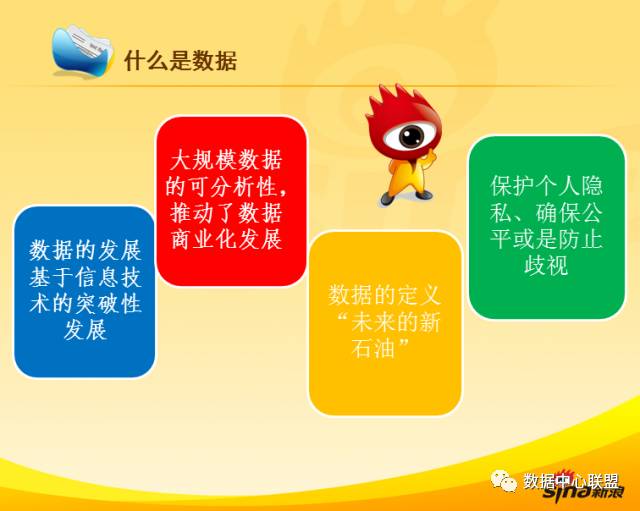 什么是数据,对于我们来说数据应该是很多样的,像之前所说的黄页以及自己记的笔记都是属于数据。但是为什么在现在大数据时代,我们更加关注“数据”?而这正是信息技术的突破性发展。正如之前讲到的开发海量数据进行有效的分析,同时得到商业化的内容,这个时候我们说数据才具有更多商业价值的属性。无论是互联网公司还是企业,甚至之前的运营商,才会认为数据有更多的商业价值。大家看到数据的定义,是奥巴马政府提出来的,它已经把大数据上升到国家战略层面,而无论是美国还是我们国家,都把大数据的整个发展和规制提到了日程上来。大数据到底是什么样的内容?里面可能更多地关注到个人隐私,比如公平。