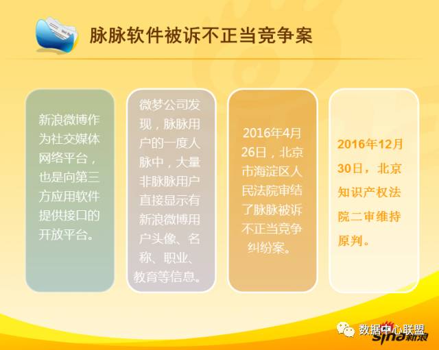我们所说的脉脉软件被诉不正当竞争案就是基于OPEN API。脉脉其实是我们曾经的一个第三方应用软件的合作方,但是微梦公司是微博的实际运营方,在合作过程中发现,脉脉的注册用户大量地存在注册用户和非注册用户混用的形象,比如直接使用了新浪微博的用户头像、名称和职业信息,这个具有很明显的指向性,被认为可能存在侵犯用户个人相关隐私的情况。考虑到现有的法律制度,提起了不正当竞争。此案在2016年12月30日宣判,被认为是大数据时代针对个人信息和用户信息保护的实案。