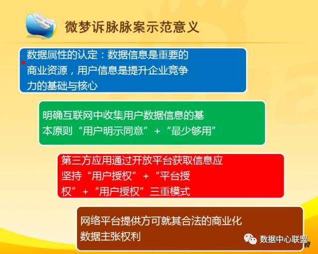第一,对于数据属性的认定。通过司法案例确认一个数据信息是重要的商业资源,像之前给大家介绍的一样,它在未来被定义为新石油,对于各个公司的商业价值不言而喻。用户信息是提升企业竞争力的基础和核心,对于数据的应用,以及个人用户信息的滥用,到底通过什么样的方式进行保护?这个是通过微梦诉脉脉的案子得到了一定的确认。
