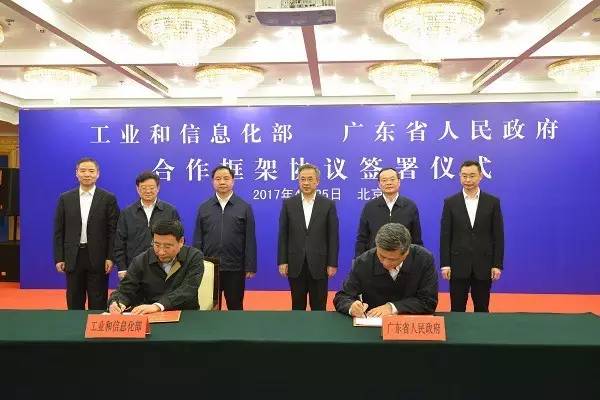 4月25日,工信部部长苗圩与广东省人民政府省长马兴瑞在北京签署了《工业和信息化部广东省人民政府合作框架协议》,广东省将以此次签署合作框架协议为契机,全面深化部省合作,加快推进引领性、关键性、基础性重大项目建设,努力将广东打造成为全国智能制造示范区、互联网创业创新高地和军民融合示范区。