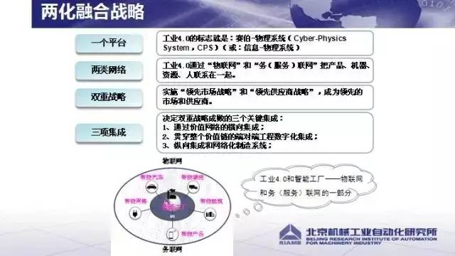 下面我谈谈北自所能为制造业做什么。两化融合战略是十八大提出的战略,这个战略和德国工业4.0是相匹配的,信息化与工业化深度融合中的信息化和工业化是广义的,只是一个相对的概念,它们包括数字化、网络化、智能化、自动化等等。德国提出工业4.0战略,但是对于目前国内整个制造业现状来讲应该是2.0、3.0和4.0并存。工业4.0的核心就是一个平台、两类网络、双重战略和三项集成。一个平台就是大家经常说的信息物理平台;两类网络就是指物联网和务联网;双重战略就是领先市场战略和领先供应商战略;最主要是三项集成,通过价值网络的横向集成、数字化集成和纵向集成。