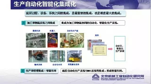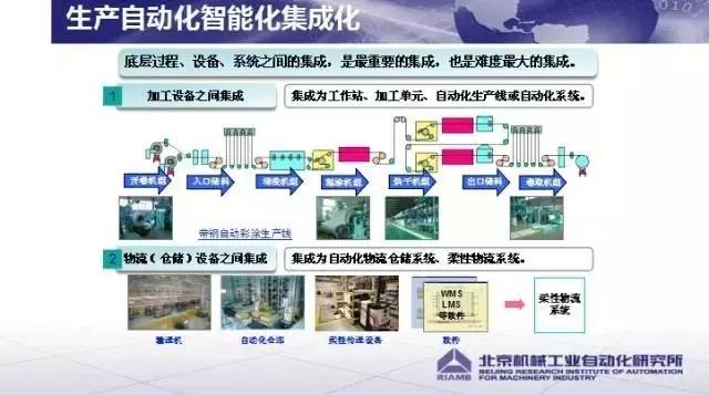 一个典型的数字化或者智能工厂或者是数字化车间,基本上就包含以下几个元素,工业智能机器人,柔性的传输设备,自动化物流系统,以及控制前面三项设备运转相应的智能控制软件。工业机器人现在是典型的智能制造装备,机器人系统在生产上现在得到了一些应用,也是大势所趋。对于制造业,从两化融合的角度,我们可以把这各企业分成三个层级,一个是公司经营管理层、车间生产制造程,还有过程设备控制层,通常我们把层级之间的应用和设备之间的集成称为横向集成,剩下层级之间的集成称为纵向集成。横向的集成,它基本上都是通过各种软件来实现的。对于制造业来讲,首先第一步就是要实现加工设备的集成,也就是说要实现生产的自动化;另外一个集成就是我们要实现仓储设备、物流设备之间的集成,就是我们要建立一个适应制造业生产和车间内部的柔性物流系统;另外最关键的集成,最难做的,就是加工和物流系统之间的集成。有了前面三个集成之后,我们再添加相应的生产管理软件,这样就形成标准的数字工厂或者自动化车间。纵向集成是工厂两化融合的核心,也是瓶颈难点所在。