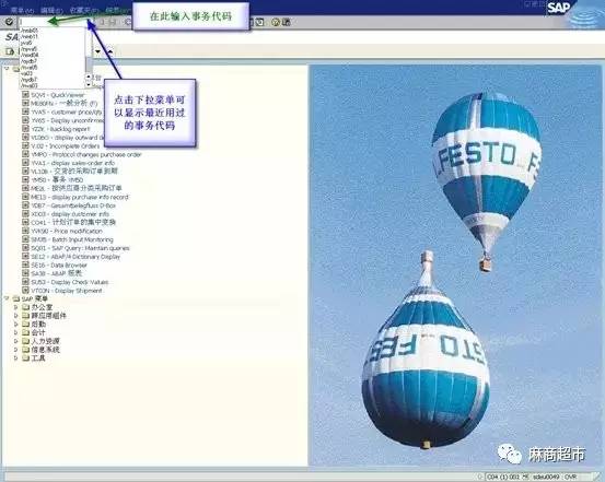 在左上角的空白处输入事务代码。事务代码相当于一个命令,不同的命令便于我们在系统中做不同的操作。