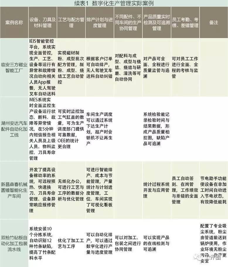 以智能生产线、智能车间为基础,各种生产及生产辅助设备的物联CPS(Cyber-Physical Systems,信息物理系统),一举改变了企业依靠人工管理的状况,实现了无纸化、数字化生产管理,如表1。