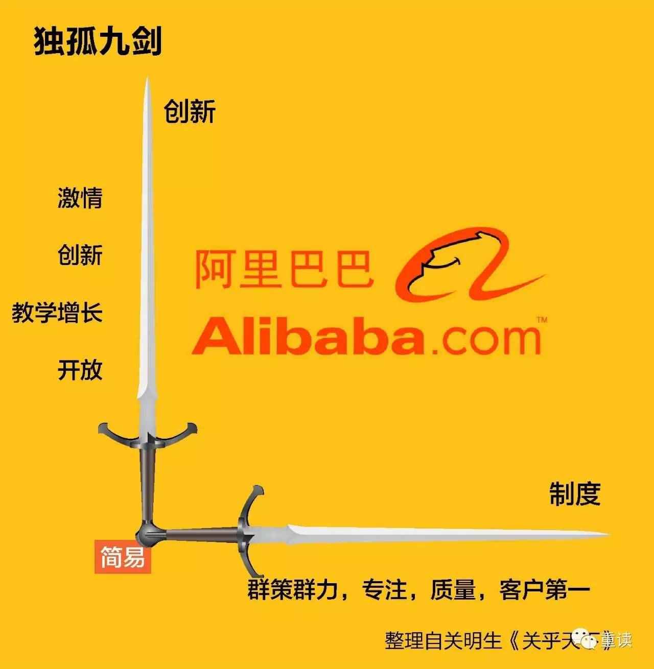 阿里巴巴集团出品的《阿里味儿》丛书记载了关明生对独孤九剑的解释:“独孤九剑有两个轴线。