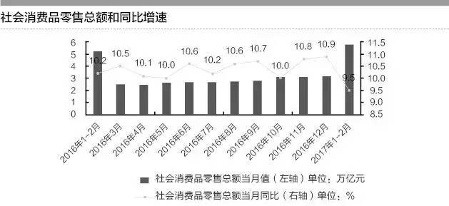 1-2月份,我国社会消费品零售总额57960亿元,同比名义增长9.5%,增速比去年同期回落0.7个百分点。主要是受汽车类销售下降1%影响,若扣除汽车类消费,社会消费品零售总额增速与上年同期基本持平。