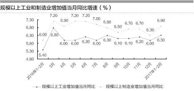 2017年1-2月份,我国规模以上工业增加值同比增长6.3 %,较去年12月份高0.3个百分点,较去年同期高0.9个百分点。
