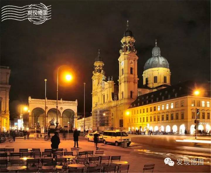 尤其市中心奥登广场(Odeonsplatz)附近,是慕尼黑中心最漂亮的广场。提起它,人们总会想到坐落在那里的意大利风咖啡馆。或许是因为它位于安静而有着意大利后巴洛克风格的铁阿提纳教堂附近,夜晚的这里有着浓浓的意大利风情。