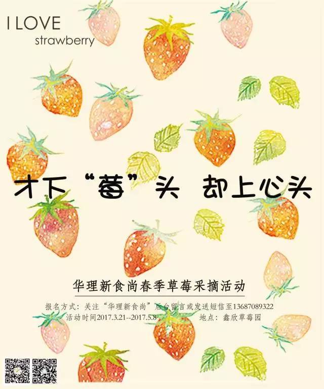【活动简介】:对草莓的喜爱,才下“莓”头,却上心头。又到了草莓成熟的季节,还记得去年我们摘过的草莓吗?红红的小果子,饱满而甜蜜,亲手摘一篮子草莓,心情好一天哦!新食尚春季草莓采摘活动又要开始啦,约上小伙伴,提起小篮子,向草莓前进!