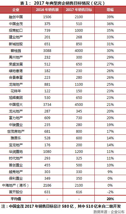 随着3月下旬房企陆续开完16年业绩发布会,17年的销售目标也陆续对外公布。从已经正式公布的销售目标来看,多数房企的目标制定显得保守与稳健。整体来看,17年对外销售目标较16年合同销售额增长均值仅为20%。但从我们了解的情况来看,房企的内部目标却并非如此。以三大龙头房企为例,三家房企今年的销售金额早已过了千亿,按照这个速度,全年实现5000亿的销售并不难。所以一直有传言称,三家房企17年要实现5000亿的内部目标,看来也不是空穴来风。