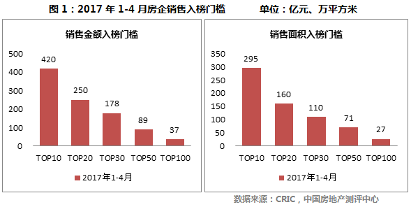 4月房地产市场成交继续分化,一二线成交仍处于相对低位,这对重点布局一二线的企业业绩产生了压力,例如华润、金茂、滨江等;而三四线城市的崛起则对相应布局的企业提供了业绩上涨动力,特别是龙头房企,在三四线城市布局较广业绩增长幅度更大。从金额门槛来看,TOP3和TOP30均已超出去年上半年水平。TOP3门槛达到1440亿,远超去年上半年第三名的1221亿。TOP30门槛已经达到178亿,也超越去年上半年的174亿。