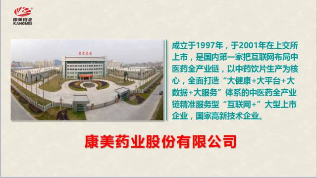 中医药产业的龙头企业康美药业有什么样的厚度?康美药业股份有限公司(600518)成立于1997年,于2001年在上交所上市,是国内率先把互联网布局中医药全产业链,以中药饮片生产为核心,全面打造“大健康+大平台+大数据+大服务”体系的中医药全产业链精准服务型“互联网+”大型上市企业,国家高新技术企业。