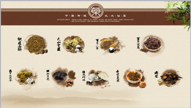 九大仙草:铁皮石斛,天山雪莲,人参,首乌,茯苓,灵芝,珍珠,冬虫夏草,苁蓉。我们的产品《铁皮石斛西洋参》对应铁皮石斛,我们的《参胶元》对应灵芝、人参,我们的《新开河暖茶》对应人参,我们的《雪肌元》对应天山雪莲,我们的《参姿护肤品》对应冬虫夏草。