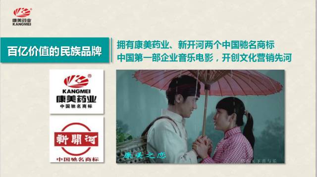 民族品牌,家喻户晓由影视明星李冰冰、任泉主演和歌唱家谭晶主唱的音乐电视《康美之恋》已在央视投播多年、传唱已久。作品风格优雅、情深意长,美妙动听的歌曲诉说着中药人悬壶济世的信念与情怀,瑰丽秀美的桂林山水见证着男女主人公相知相恋、艰苦创业的感人故事。