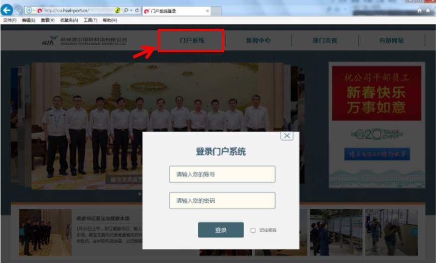 (一)用浏览器输入访问地址进入门户网站:http:// oa.hzairport.cn,初始用户名及密码请致电86662321咨询。