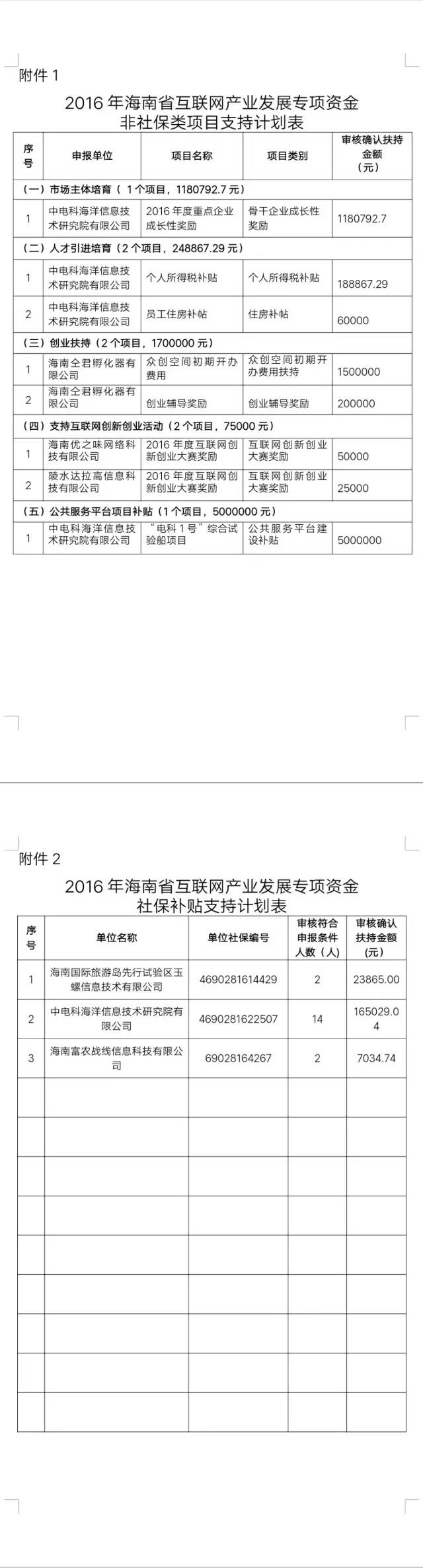 根据《陵水黎族自治县促进互联网产业发展若干措施(试行)》(陵府〔2016〕38号)、《陵水黎族自治县互联网产业发展专项资金管理暂行办法》(陵府办〔2016〕291号)的有关规定,县工业与信息化局、县财政局于2017年2月印发了《关于组织申报2016年陵水黎族自治县互联网产业发展专项资金项目的通知》(陵工信〔2017〕16号)。经县工信局初审申报材料,与县财政局、第三方机构对申报企业进行复审后,拟将中电科海洋信息技术研究院有限公司公共服务平台建设项目等11个项目纳入2016年陵水县互联网产业发展专项资金支持计划,现予以公示,公示时间为2017年4月27日至5月3日。 任何单位和个人如有异议,请在公示期内以书面形式向受理单位提出。提出异议的,应当在异议材料上签署真实姓名或加盖单位公章,并注明联系方式。 受理单位:陵水黎族自治县工业与信息化局 联系电话:0898-83314816 地址:陵水黎族自治县建设路156号县政府大院A115办公室 邮编:572400
