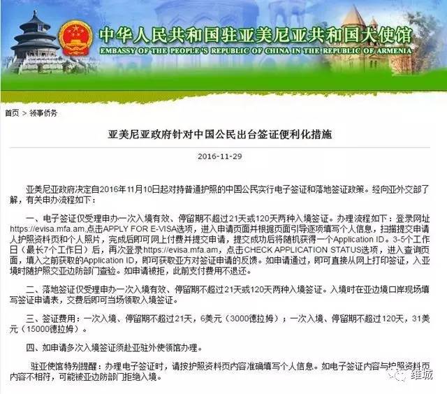 2016年11月10日起,亚美尼亚对中国实行电子签和落地签两种(一次停留时间不超21天为6美元,不超120天为31美元,如果要申请多次入境,需要到亚美尼亚驻外使领馆办理),虽然不是完全免签,但落地签只要在口岸现场填写申请表,交6美元,就能直接入境,也是足够便利和便宜的。
