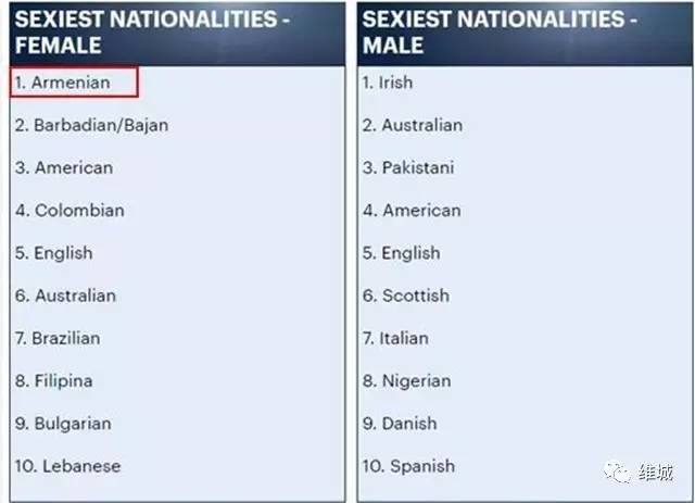 去年9月某网站投票显示,亚美尼亚美女荣膺“全球最性感女人”,巴巴多斯、美国、哥伦比亚紧随其后;而全球最性感男人在爱尔兰,其次是澳大利亚和巴基斯坦。